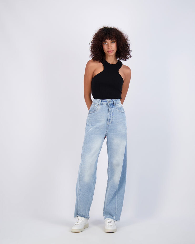 The Paloma Curved Wide Leg in washed blue is the perfect unique piece for a denim lover. These jeans are high waisted and lightweight, offering a relaxed fit and tons of movement. Paloma's silhouette has a slight curve at the knee, giving this style a clean and modern look. We love the Paloma with heels or sneakers and a fitted top.